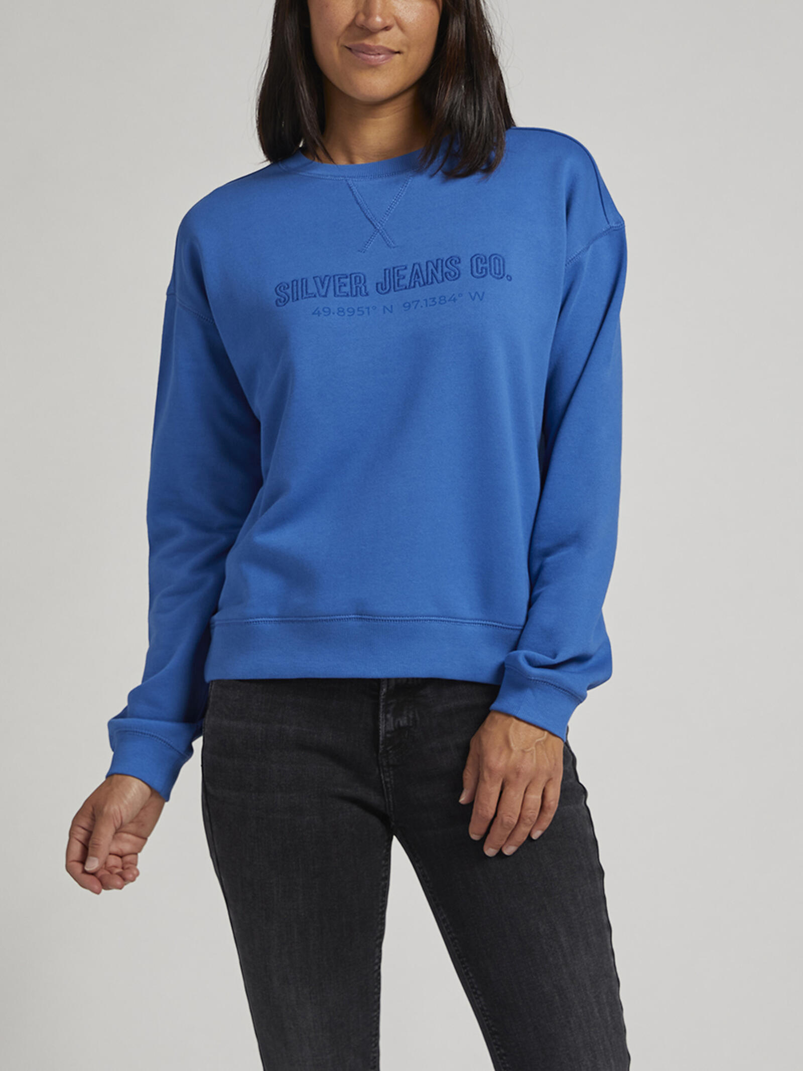 Our women’s crewneck sweatshirt is made with extra soft 100% French terry cotton, making it a cozy wardrobe essential. It has an embroidered Silver Jeans Co. logo and screen printed geographic coordinates for our home town in Winnipeg, Canada. Finished with ribbed knit cuffs on the sleeves and hem.