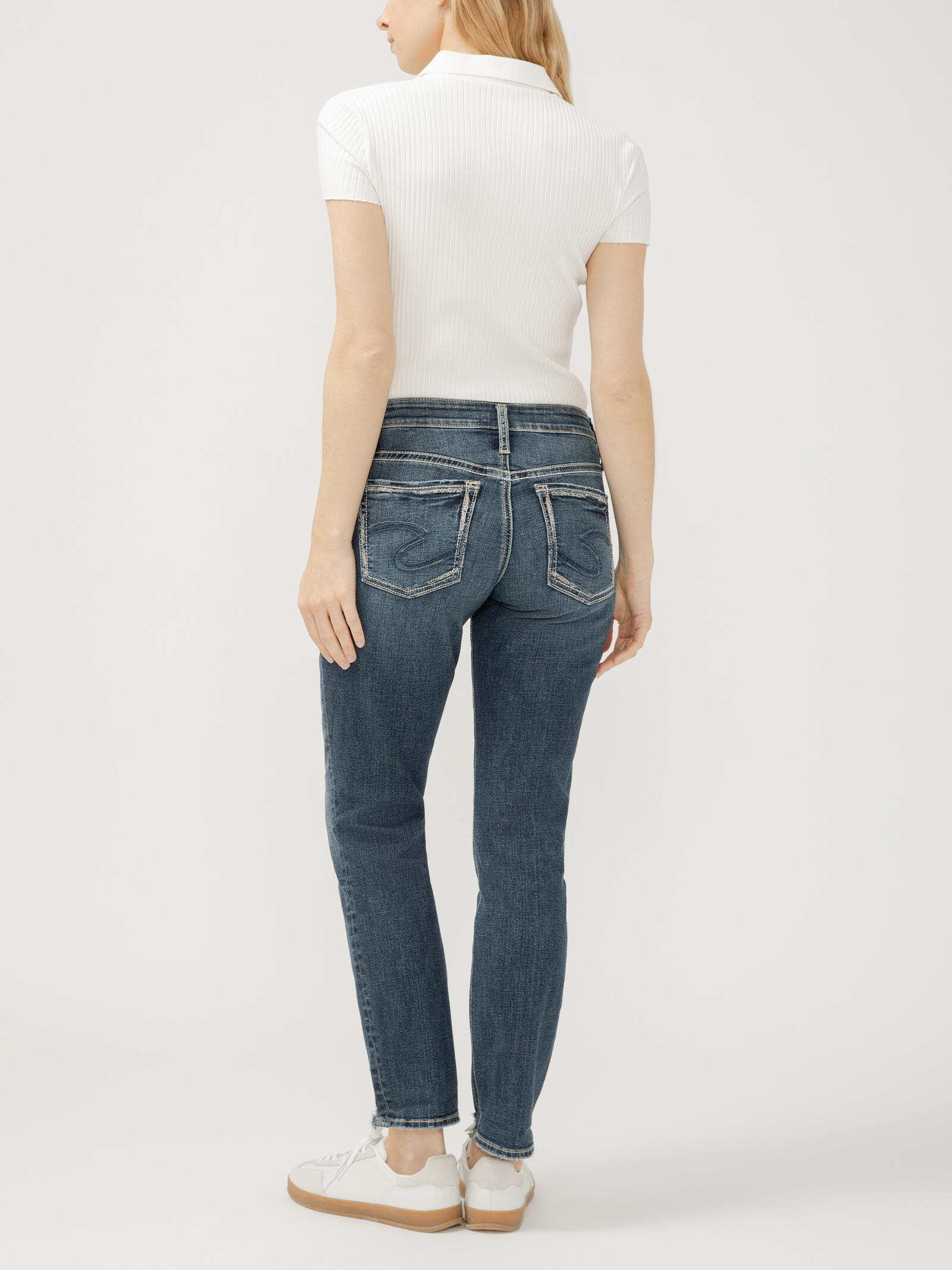 Love the fit the dark wash bigger back pockets ! Wasn’t sure I liked the worn distressed torn at the ankles but it’s growing on me ! Love the super fast shipping and even faster returns! Silvers are my only jeans