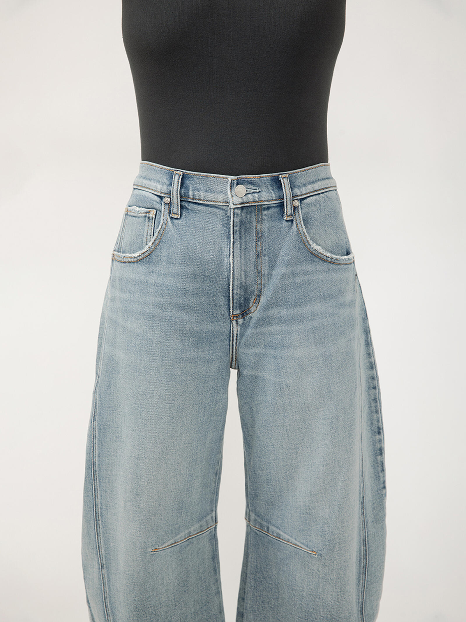 High rise jeans with a curved, tapered leg for a bold, sculpted silhouette. Designed in a light indigo wash with a modern ankle-grazing inseam, these horseshoe jeans blend structure and ease, offering a relaxed yet refined fit perfect for casual and elevated looks alike.