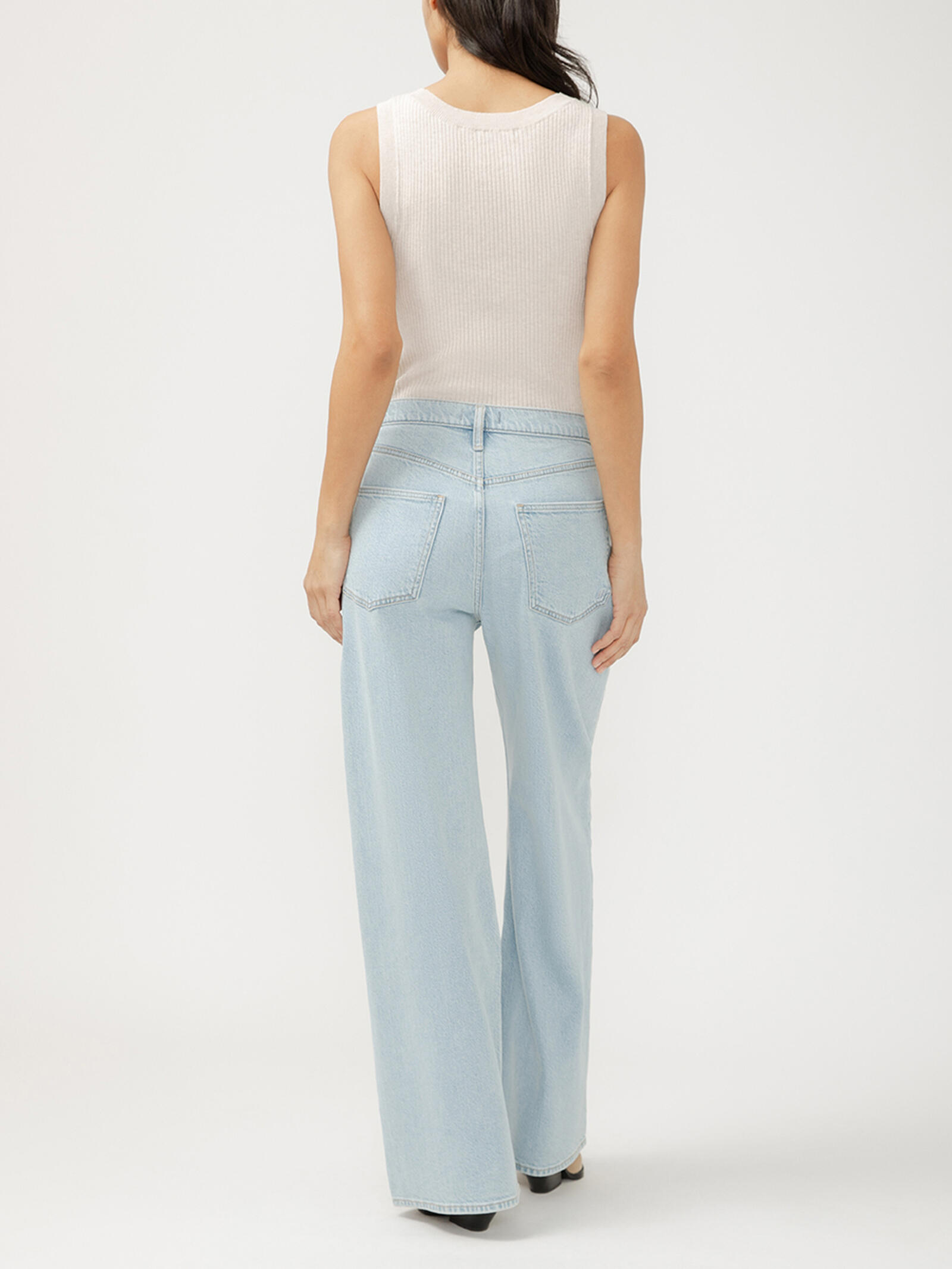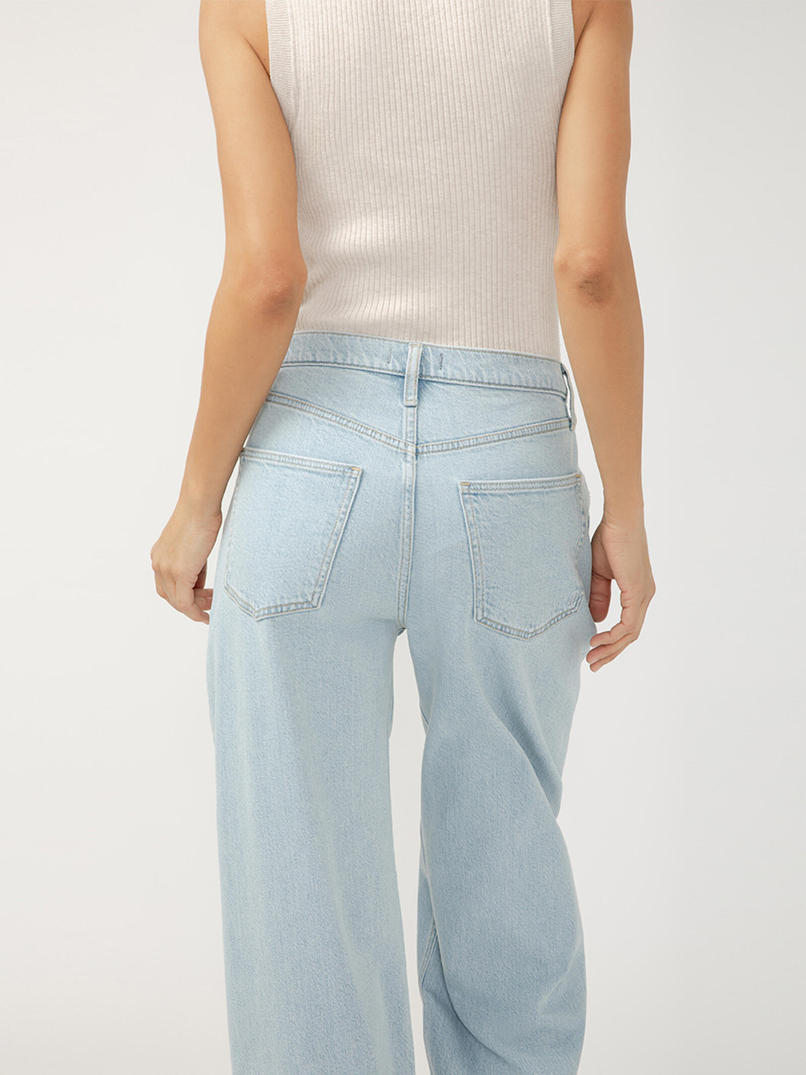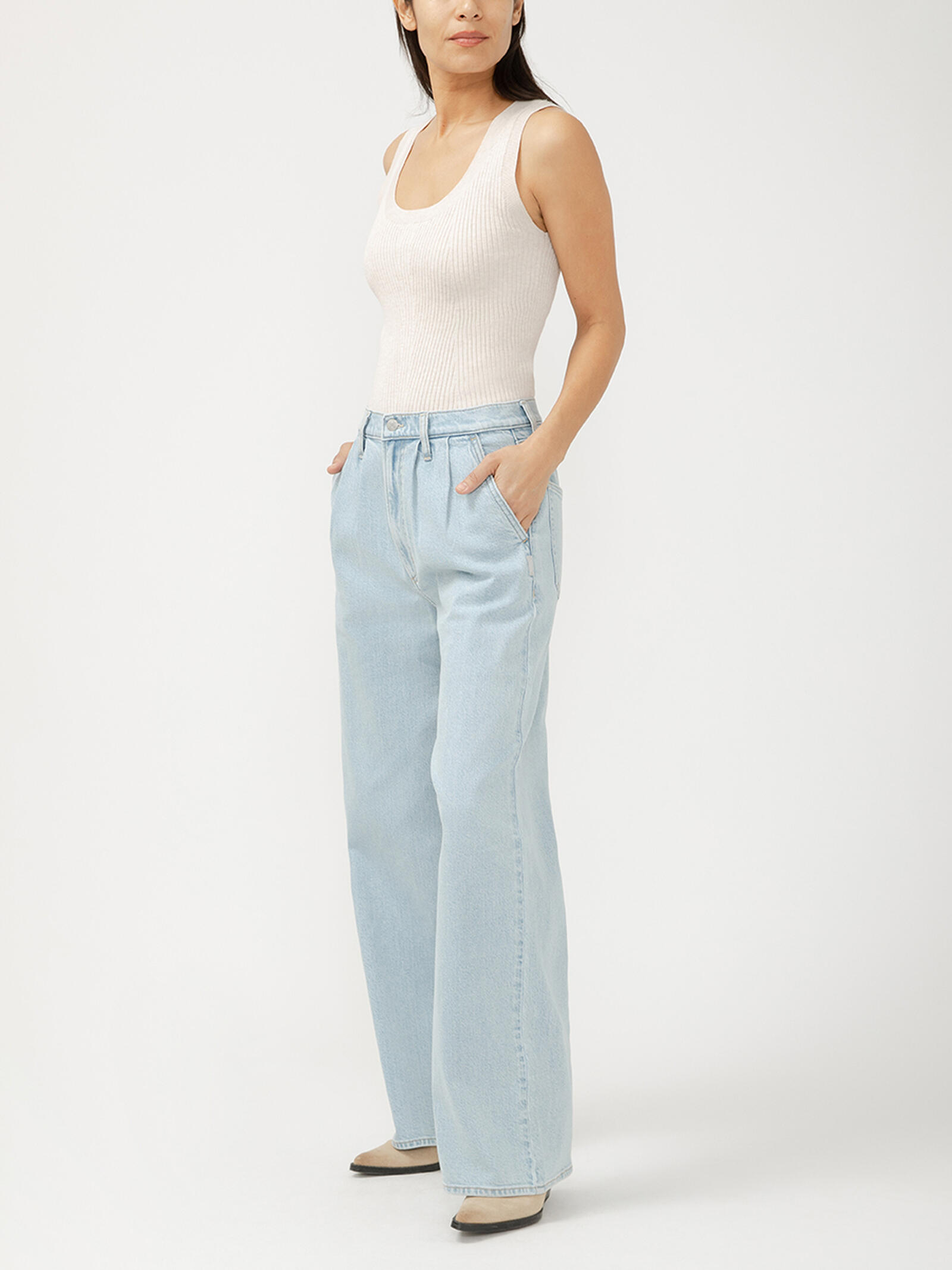 These high rise pleated trouser jeans redefine relaxed tailoring with their slouchy fit and structured wide leg. Finished in a light indigo wash, they offer a fresh, modern take on classic denim—perfect for effortless style that works anywhere.