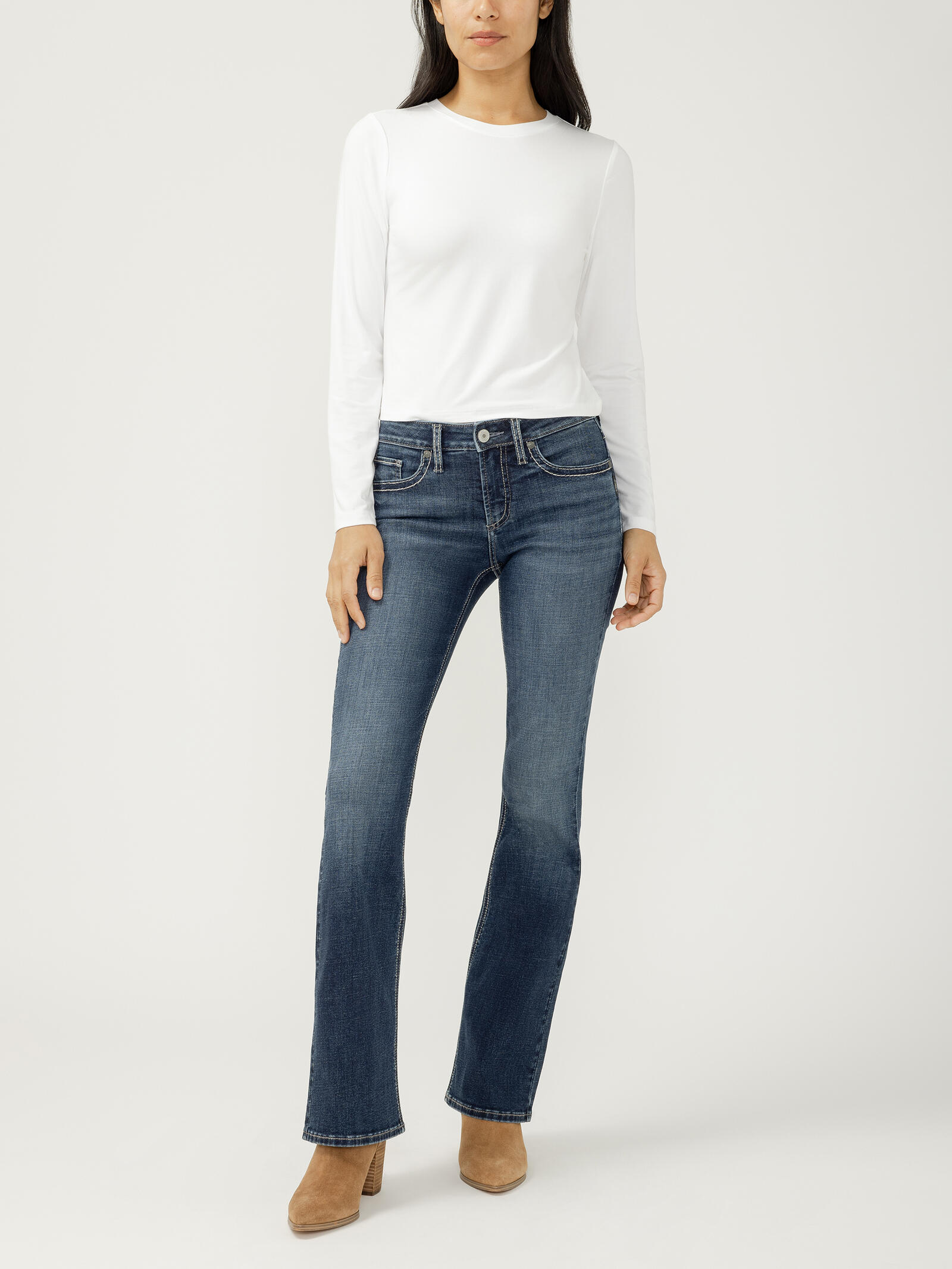 Suki is the best-selling Silver Jeans Co.™ curvy fit for good reason. Designed to enhance curves, this pair creates a flattering silhouette with ease in the hip and thigh to hug every angle. The classic mid rise is comfortable, and the contoured waistband ensures a zero-gap fit.