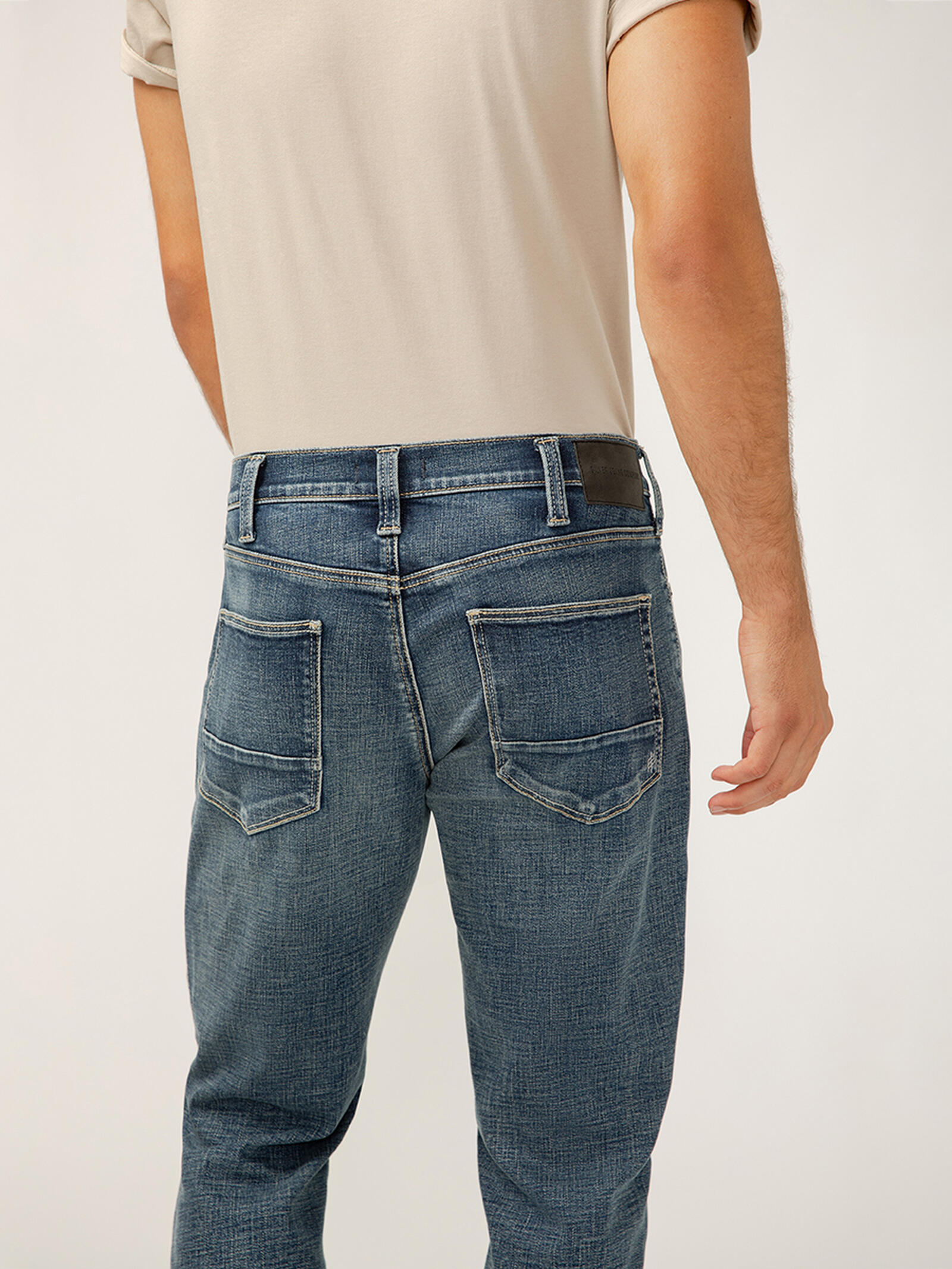 • Slim straight leg jeans in a medium indigo wash