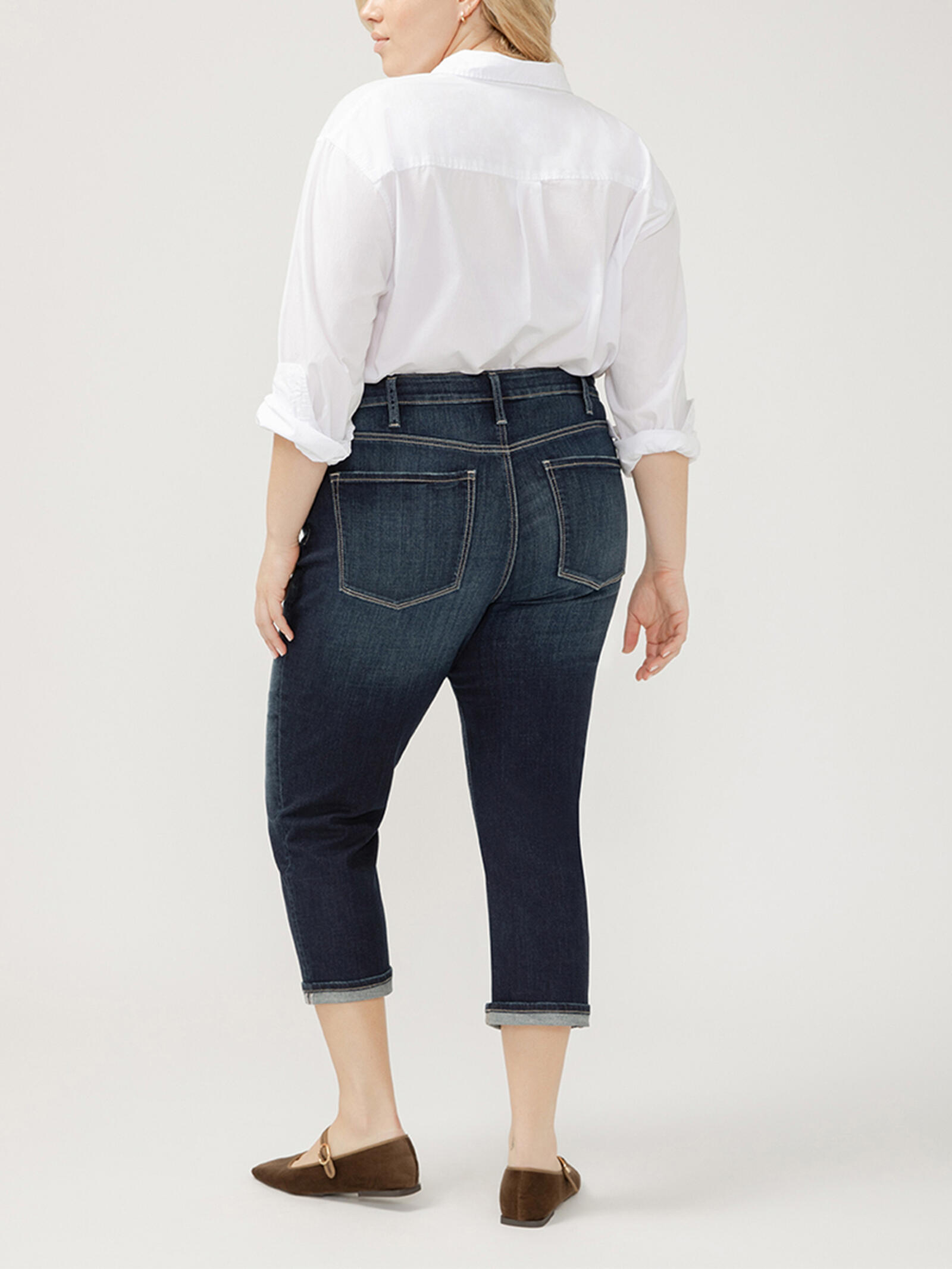 • Capri leg jeans in a medium-dark indigo wash